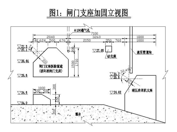 由于使用不當造成翻板閘門支座破損,因此可按原設計進行修復。將受損的支座砼清理鑿除后,重新澆筑C30鋼筋砼支座。加固方案為:采用植筋法將閘門支座鋼筋錨固在閘墩中,閘門支座四周預埋鋼板以增強支座抗拉剪能力。詳細做法是: