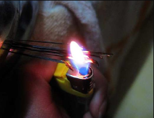 用手搓單絲看看是否能展開,并且單絲上會(huì)有一層黏黏的東西,是上漿劑(樹脂),將點(diǎn)燃的打火機(jī)燃燒碳纖維,真的碳纖維是不會(huì)燃燒的,而假的都會(huì)燒起來,因?yàn)樘祭w維本身可以耐超高溫。下圖為假碳布用火燒后的效果