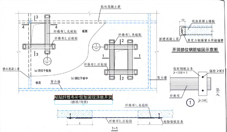 粘貼纖維布補償加固現(xiàn)澆板開洞如下圖