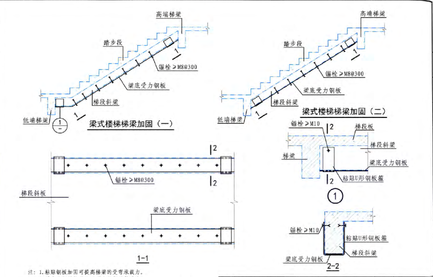 3. 1 梁式樓梯中,梯段板為單向斜板,跨度較小,梯段自重和 活荷載沿短向傳遞至兩側(cè)斜梁,梯段斜梁和斜板的加固原理和 具體方法可采用板式樓梯加固的做法。