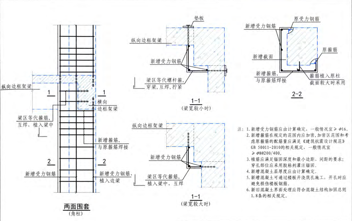 1.新增 力鋼筋應(yīng)由計(jì)算確定,一 般情況宜》 φ16新增箍筋在規(guī)定的 范圍內(nèi)應(yīng)加密, 力口密區(qū)范圍和考慮原箍筋的配筋量應(yīng)滿足《建筑抗震設(shè)計(jì)規(guī)范》GB 50 1-2010 的相關(guān)規(guī)定,一般情況宜φ8 @200/ 400.