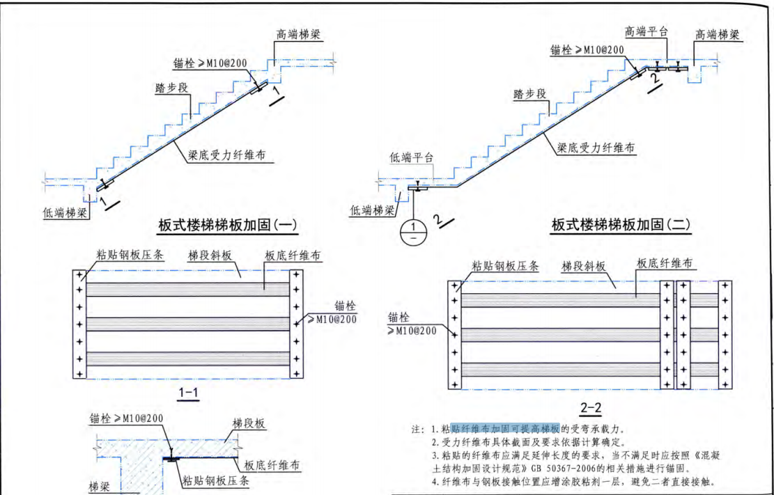 1. 粘貼纖維布加固可提高梯板的受彎承