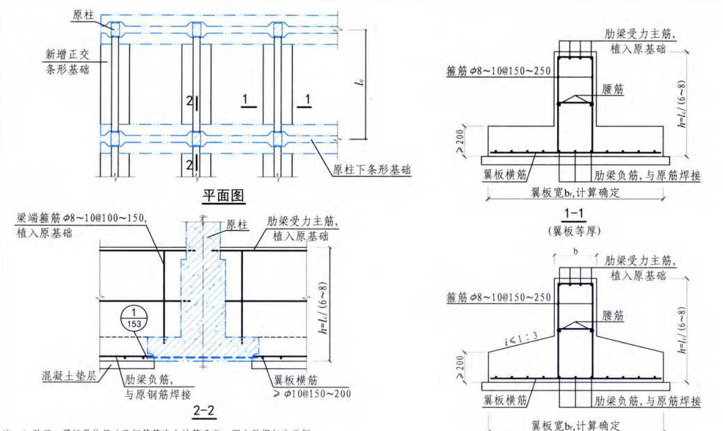 2. 新增條形基礎(chǔ)截面形式 般為肋梁式,肋梁截面總高 ,取h=lcl (6 ~ 8) , /C為原來(lái)?xiàng)l基問(wèn)距 肋梁底板(翼板)一般做成變截面,坡度I1;3 ,邊緣厚200 mm ,根部> 300mm"