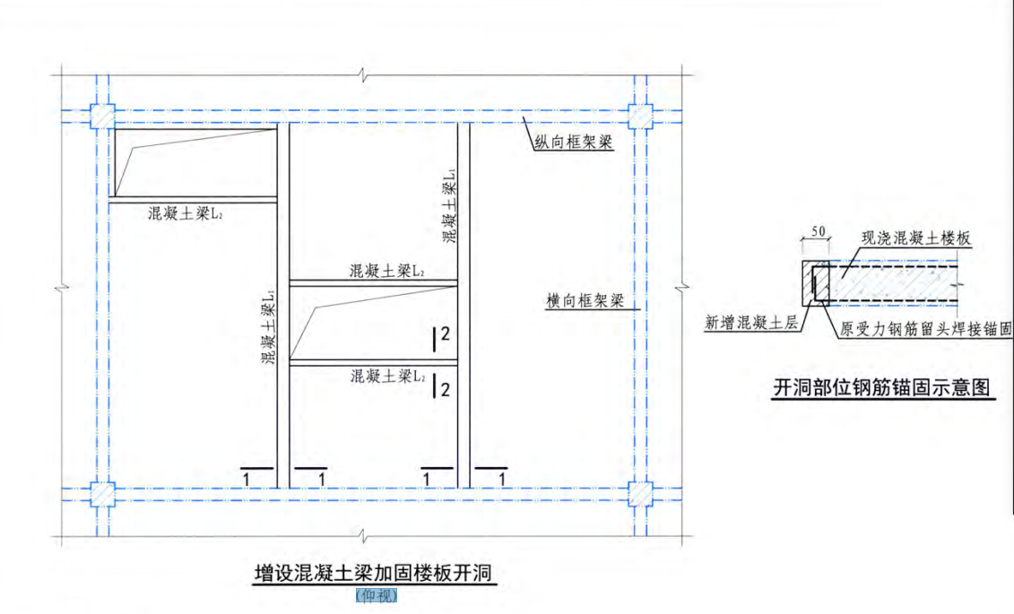 下圖為 增設混凝土梁加固樓板開洞(仰視)圖