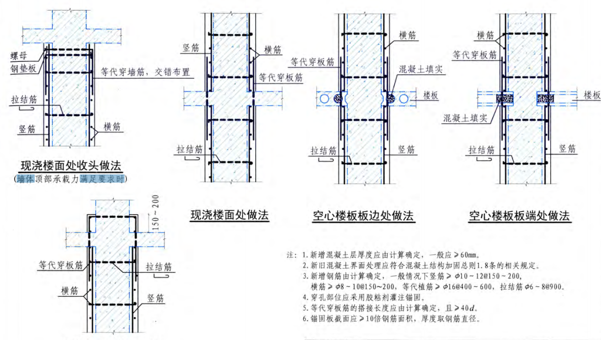 下圖介紹了1. 現(xiàn)澆樓面處收頭做法 2.現(xiàn)澆樓面處做法 3.空心樓板板邊處做法4.空心樓板板端處做法 5.現(xiàn)澆樓面處收頭做法(墻體頂部承載力不滿足要求 時(shí))