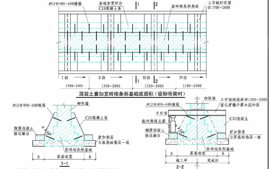 1.卸荷施工工序如下:磚墻鑿孔穿工字鋼卸荷梁-澆筑鋼筋混凝土接邊踏臺-植筋-千斤頂卸荷-澆筑混凝土套-設(shè)置臨時卸荷支撐-拆除千斤頂-澆筑工字鋼梁下混凝土,