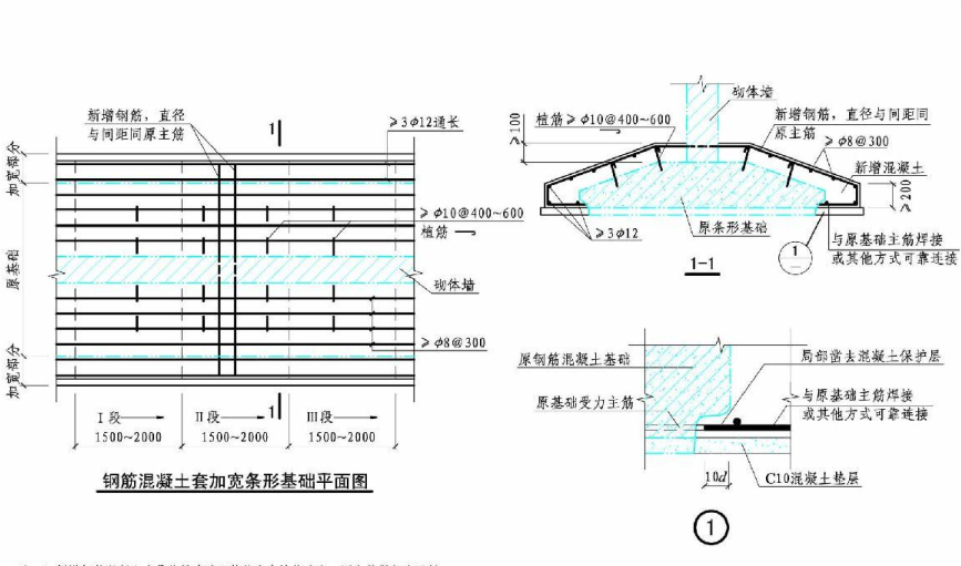 2.條形基礎加寬時,應按長度1.5-2.0M劃分成單獨區(qū)段,分批分段,間隔進行施工
