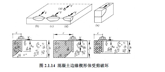 基材邊緣受剪時形成以錨栓軸為頂點的混凝土楔形體破壞形式(圖2.1.14)。