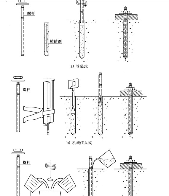 Q345 鋼螺桿。鋼筋的強度指標按現(xiàn)行國家標準《混凝土結(jié)構(gòu)設計規(guī)范》GB50010規(guī)定采用。 3.2.5 錨栓彈性模量可取 Es=2.0×105MPa。 3.3 錨固膠 3.3.1 化學植筋所用錨固膠的錨固性能應通過專門的試驗確定。對獲準使用的錨固膠,除說明書規(guī)定可以摻入定量的摻和劑(填料)外,現(xiàn)場施工中不宜隨意增添摻料。 3.3.2 錨固膠按使用形態(tài)的不同分為管裝式、機械注入式和現(xiàn)場配制式(圖 3.3.2),應根據(jù)使用對象的特征和現(xiàn)場條件合理選用。 3.3.3 環(huán)氧基錨固膠的性能指標應滿足表3.3.3 的要求。