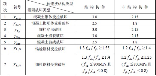 4.2.6 混凝土結(jié)構(gòu)后錨固連接承載力分項系數(shù) R γ ,應根據(jù)錨固連接破壞類型及被連接結(jié)構(gòu)類型的不同,按表4.2.6 采用。當有充分試驗依據(jù)和可靠使用經(jīng)驗,并經(jīng)國家指定的機構(gòu)技術(shù)認證許可后,其值可作適當調(diào)整。 表 4.2.6 錨固承載力分項系數(shù)R