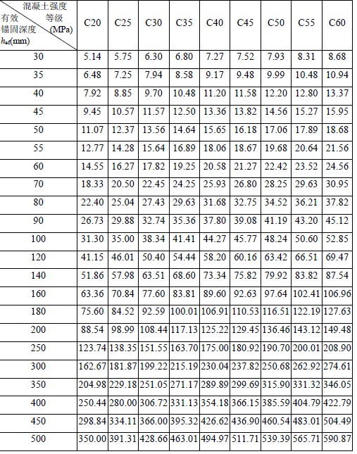 表6.1.4 單根膨脹型錨栓、擴孔型錨栓受拉,混凝土錐體破壞承載力標準值oRk,c N (kN)