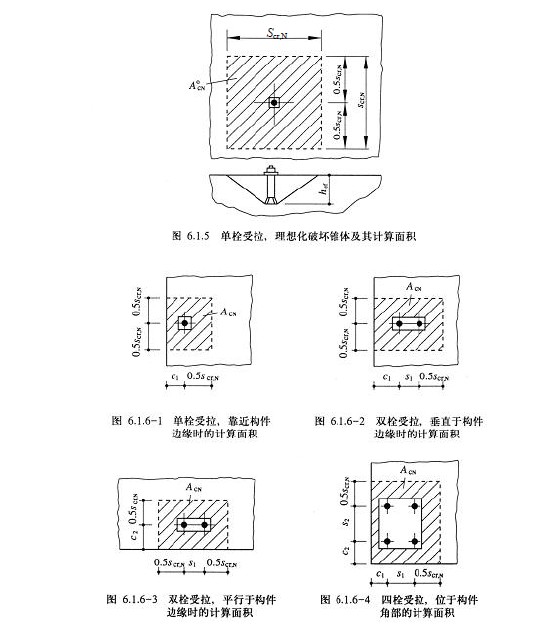 6.1.6 群錨受拉,混凝土破壞錐體投影面面積Ac,N,應根據(jù)錨栓排列布置情況的不同,