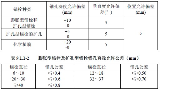 9.3.3 擴孔型錨栓和膨脹型錨栓的錨固操作應按產(chǎn)品說明書的規(guī)定進行。 9.3.4 化學植筋的安裝應根據(jù)錨固膠施用形態(tài)(管裝式、機械注入式、現(xiàn)場配制式) 和方向(向上、向下、水平)的不同采用相應的方法?;瘜W植筋的焊接,應考慮焊 接高溫對膠的不良影響,采取有效的降溫措施,離開基面的鋼筋預留長度應≥20d, 且≥200mm。 9.3.5 化學植筋置入錨孔后,在固化完成之前,應按照廠家所提供的養(yǎng)生條件進行固 化養(yǎng)生,固化期間禁止擾動。 9.3.6 后錨固連接施工質(zhì)量應符合設計要求和產(chǎn)品說明書的規(guī)定,當設計無具體要 求時,應符合表9.3.6 的要求。 表 9.3.6 錨固質(zhì)量要求