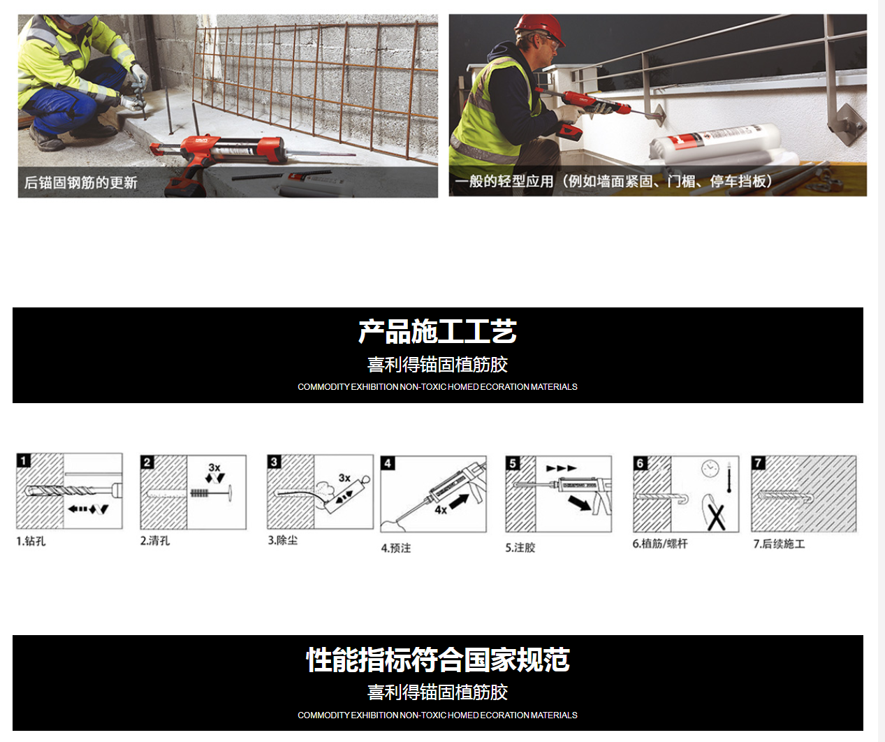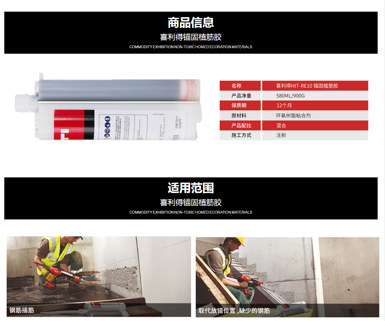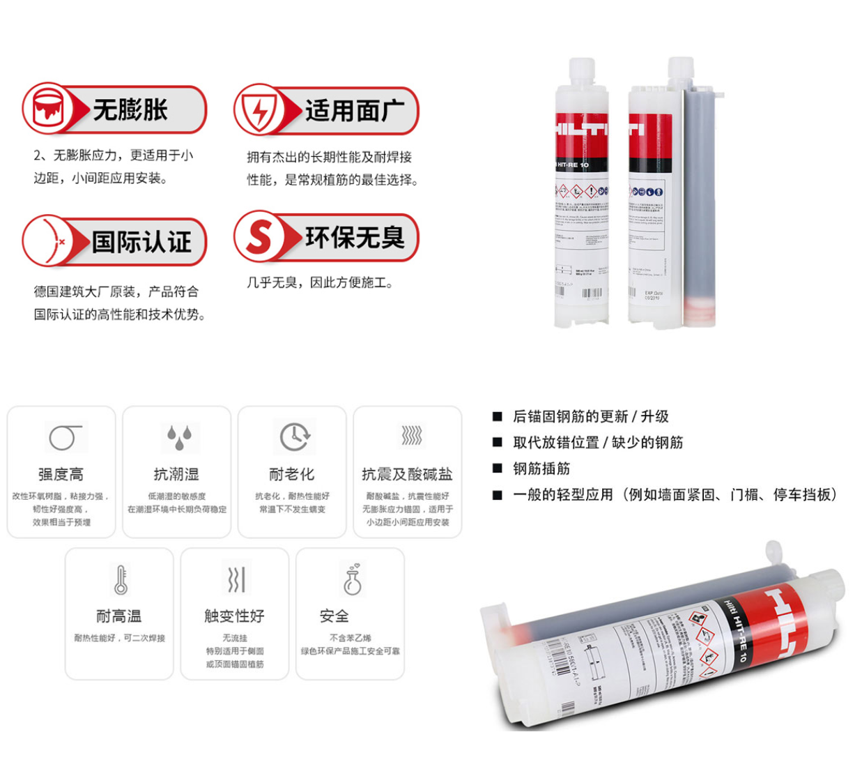 喜利得植筋膠用于混凝土結(jié)構(gòu)植筋加固,特別是重要,懸挑構(gòu)件,承重動力作用的結(jié)構(gòu),構(gòu)件等;特別是用于大直徑與埋深(如搭接)的植筋與緊固。
